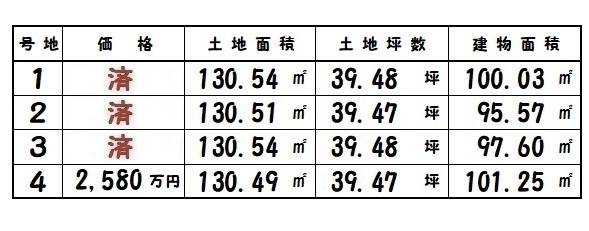| 橿原市曽我町 | 130.49㎡~/39.47坪~ | 4 | 95.57㎡~ | R7.6 | 2,580万円 |