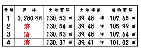 | 橿原市曽我町 | 130.31㎡~/39.41坪~ | 4 | 101.02㎡~ | R7.7完成 | 3,280万円~ |