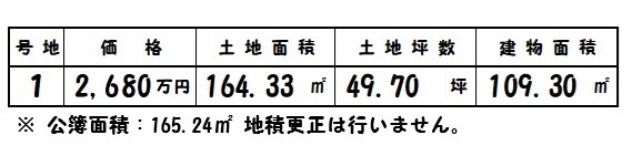 | 所在地 | 土地面積/坪数 | 総区画数 | 建物面積 | 建築年月 | 価格 |