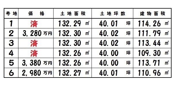 | 天理市指柳町 | 132.26㎡~/40.00坪~ | 6 | 109.30㎡~ | R7.11完成 | 2,980万円~ |