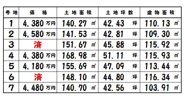 | 奈良市菅原町 | 140.27㎡~/42.43坪~ | 7 | 103.91㎡~ | R8.4完成予定 | 4,180万円~ |
