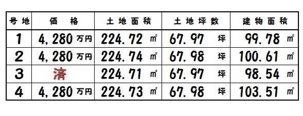 | 香芝市高 | 224.71㎡~/67.97坪~ | 4 | 98.54㎡~ | R8.7完成予定 | 4,280万円 |