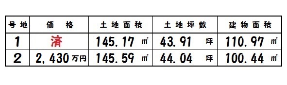| 桜井市金屋 | 145.17㎡~/43.91坪~ | 2 | 100.44㎡~ | R7.6完成 | 2,430万円 |