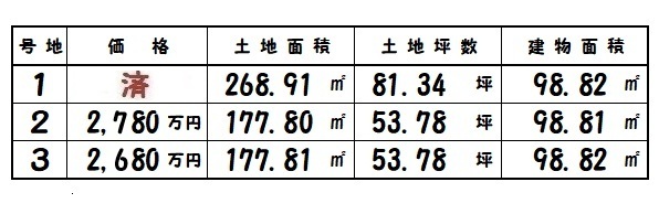 | 所在地 | 土地面積/坪数 | 総区画数 | 建物面積 | 建築年月 | 価格 |