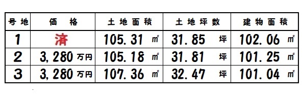 大和郡山市北郡山 | 105.18㎡~/31.81坪~ | 3 | 101.04㎡~ | R8.2完成予定 | 3,280万円 |