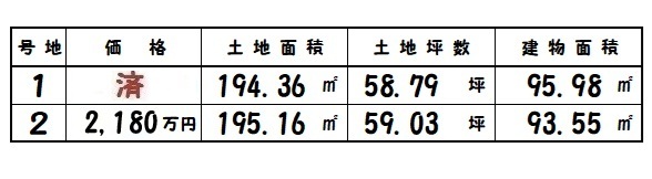 | 生駒郡斑鳩町龍田4丁目 | 194.36㎡~/58.79坪~ | 2 | 93.55㎡~ | R8.2 | 2,180万円 |