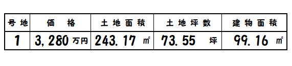 | 所在地 | 土地面積/坪数 | 総区画数 | 建物面積 | 建築年月 | 価格 |