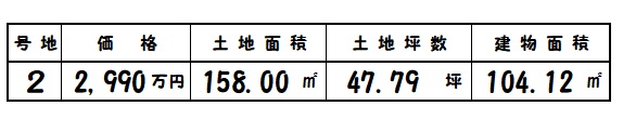 | 香芝市平野 | 158.00㎡/47.79坪 | 2 | 104.12㎡ | R8.3 | 2,990万円 |