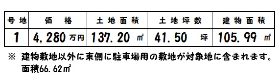 | 所在地 | 土地面積/坪数 | 総区画数 | 建物面積 | 建築年月 | 価格 |