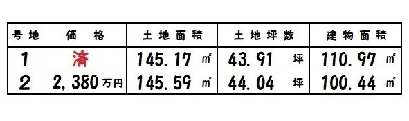 | 桜井市金屋 | 145.17㎡~/43.91坪~ | 2 | 100.44㎡~ | R7.6完成 | 2,380万円 |