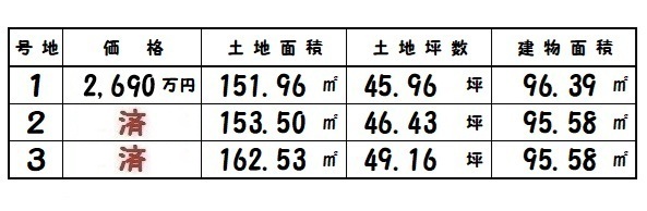 | 大和郡山市今国府町 | 151.96㎡~/45.96坪~ | 3 | 95.58㎡~ | R7.7 | 2,690万円 |