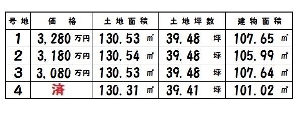 | 橿原市曽我町 | 130.31㎡~/39.41坪~ | 4 | 101.02㎡~ | R7.7完成 | 3,080万円~ |