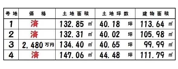 | 所在地 | 土地面積/坪数 | 総区画数 | 建物面積 | 建築年月 | 価格 |