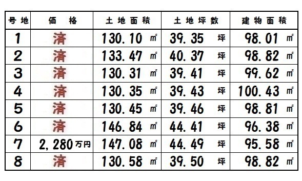 | 大和郡山市小南町 | 130.10㎡~/39.35坪~ | 8 | 95.58㎡~ | R7.4(1.2.3.4.5号地R7.5) | 2,280万円 |