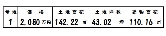 | 所在地 | 土地面積/坪数 | 総区画数 | 建物面積 | 建築年月 | 価格 |