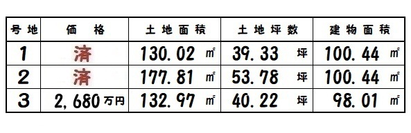 | 所在地 | 土地面積/坪数 | 総区画数 | 建物面積 | 建築年月 | 価格 |