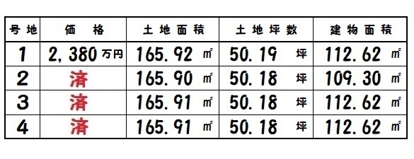 | 御所市東辻 | 165.90㎡~/50.18坪~ | 4 | 109.30㎡~ | R8.1完成 | 2,380万円 |