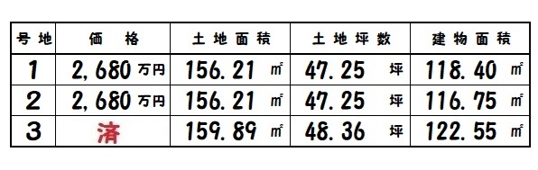 | 奈良市古市町 | 156.21㎡~/47.25坪~ | 3 | 116.75㎡~ | R8.3完成予定 | 2,680万円 |