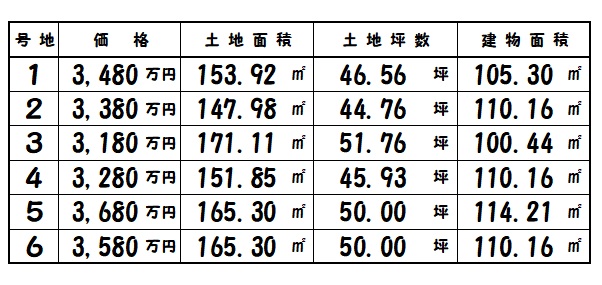 | 橿原市城殿町 | 147.98㎡~/44.76坪~ | 6 | 100.44㎡~ | R8.5完成予定 | 3,180万円~ |