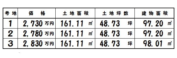 | 大和郡山市矢田山町 | 161.11㎡/48.73坪 | 3 | 97.20㎡~ | R8.7完成予定 | 2,730万円~ |